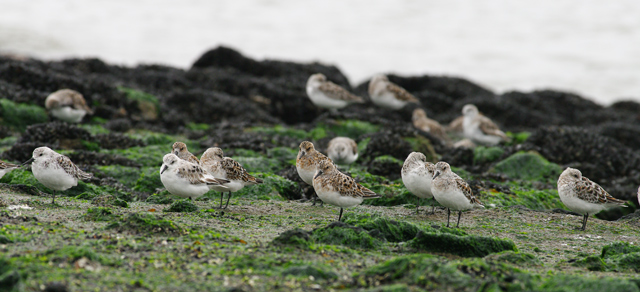 Ces digues sont faites de blocs de rochers et sont recouverts d’algues. Les bécasseaux y trouvent un peu de nourriture mais viennent là surtout pour roupiller.