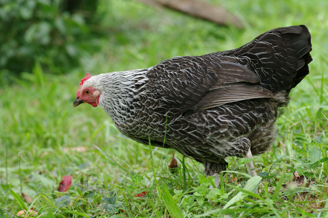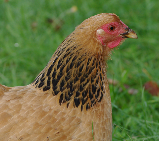 Honorine, wyandotte au plumage non standardisé (je n’ai pas trouvé sur internet de descriptif correspondant exactement à ce plumage, sans doute est-ce un croisement entre deux wyandottes aux coloris différents, Francis me disant même il y a quelques jours que ce n’est peut-être pas une wyandotte pure mais un croisement entre deux races différentes … pfhhh c’est compliqué ces coqs qui trouvent, comme nous d’ailleurs, que c’est toujours plus excitant d’aller voir la voisine … ).