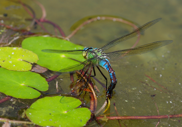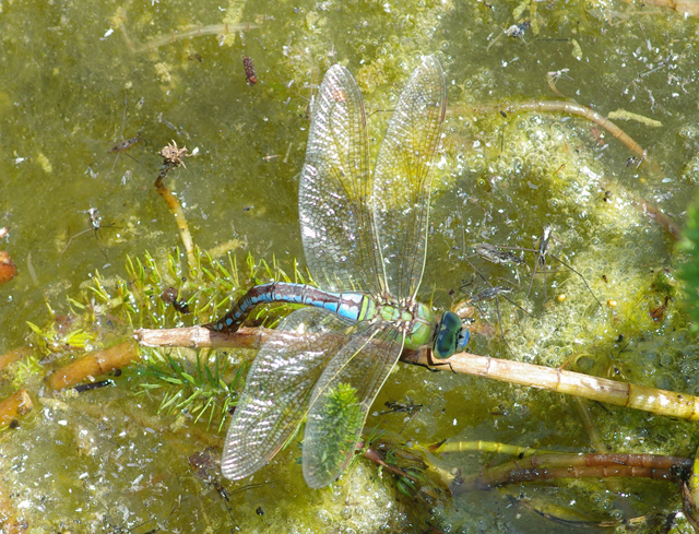 Deux espèces à l’honneur aujourd’hui. D’abord l’Anax empereur (anax imperator) que j’ai eu la chance d’observer de très près alors qu’elle était en train de pondre ses oeufs dans des plantes immergées.