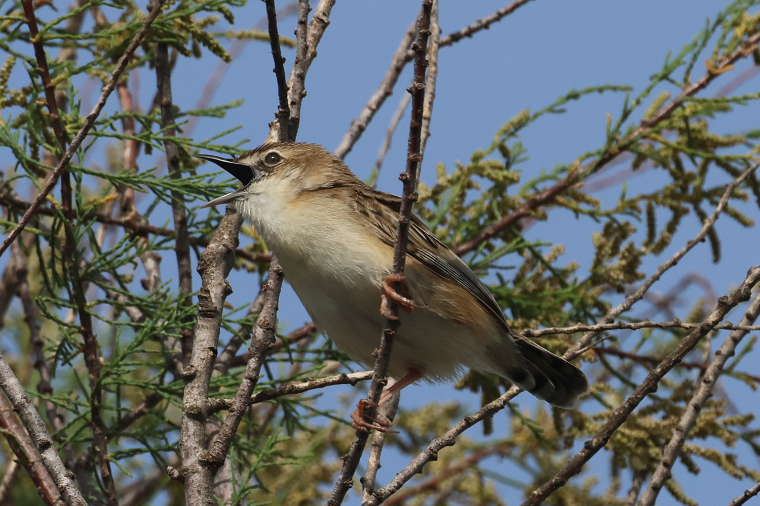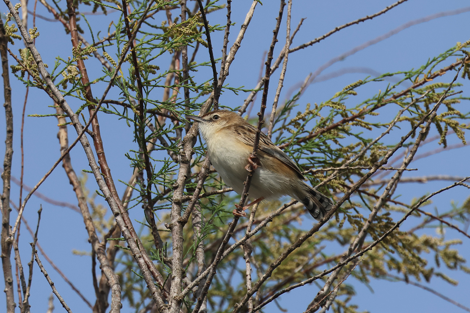 Et puis, miracle, alors que vous êtes en train de discuter sur un parking, un tsipp tsipp tsipp tsipp retentit dans l’arbre qui est au-dessus de vous. Pas de doute, il s’agit bien de la Cisticole des joncs … (je dis « la cisticole » alors que dans certains livres ornithos récents, on dit plutôt « le cisticole »).