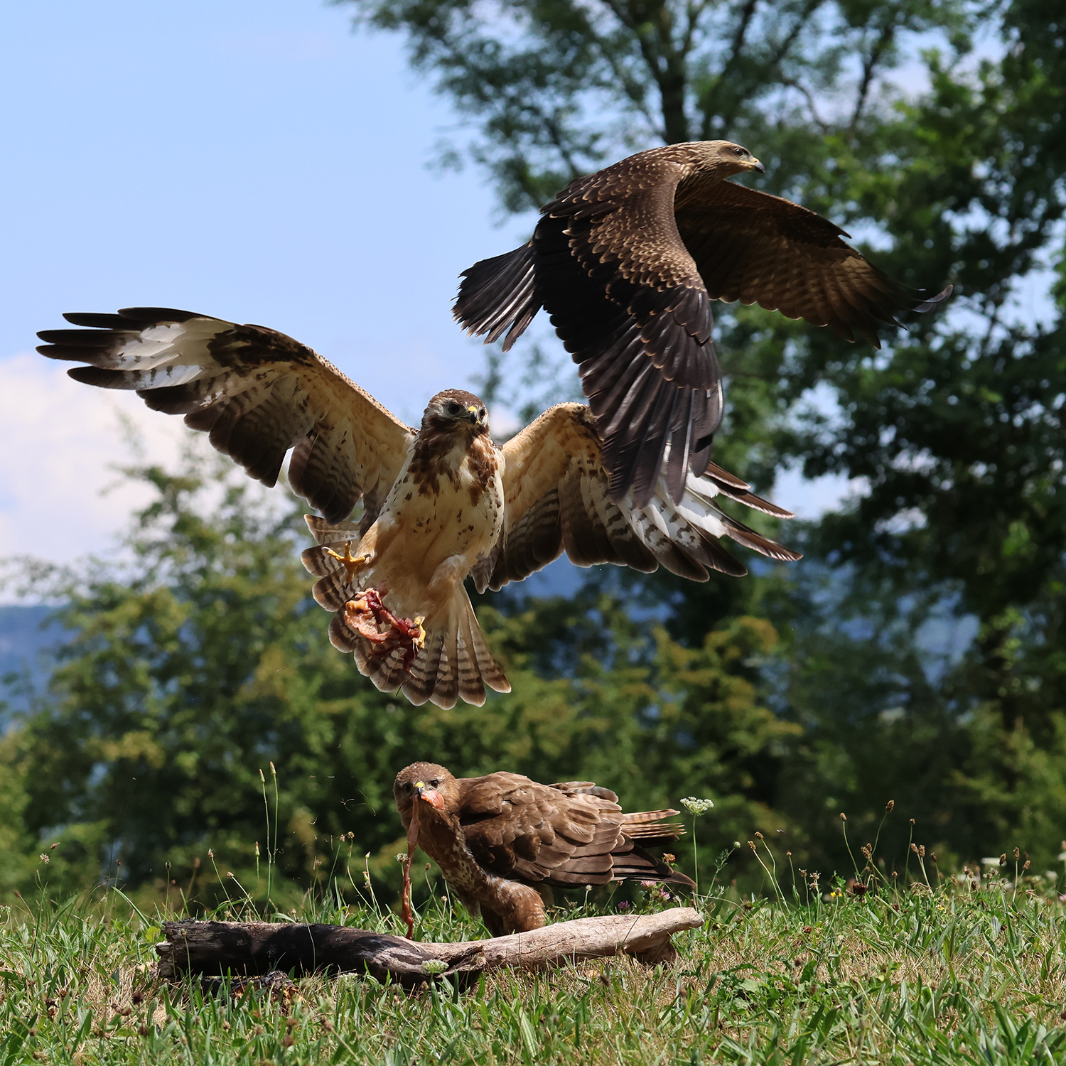 Le jeune milan noir a déjà bien acquis les méthodes de ses parents, à savoir essayer de chaparder un peu de nourriture lorsque les buses sont là. Car le milan noir, avant d’être un véritable prédateur, est surtout un chapardeur et un très grand opportuniste !