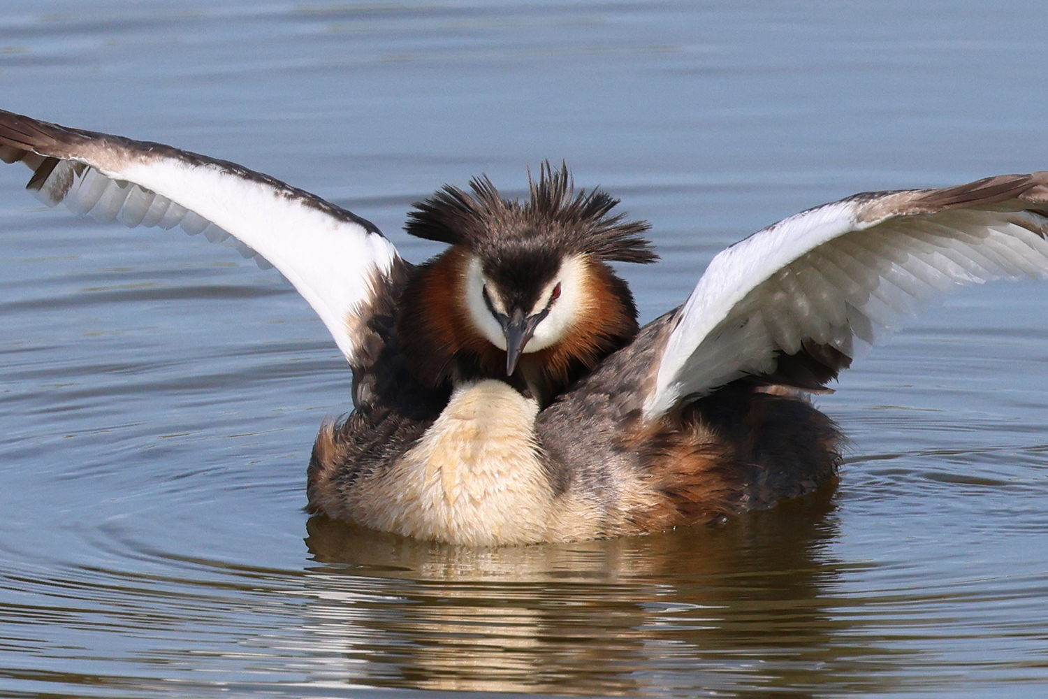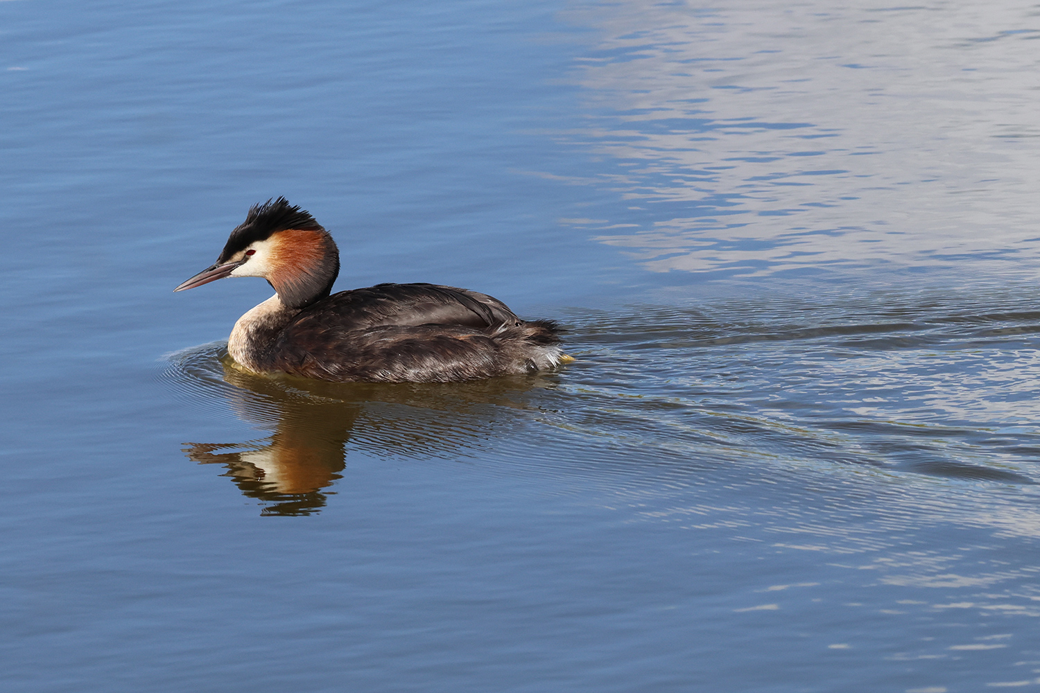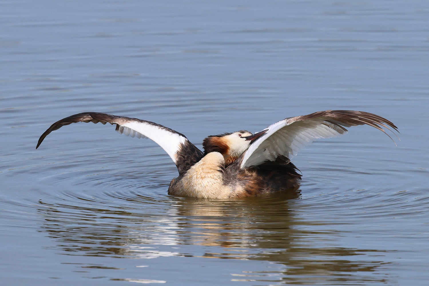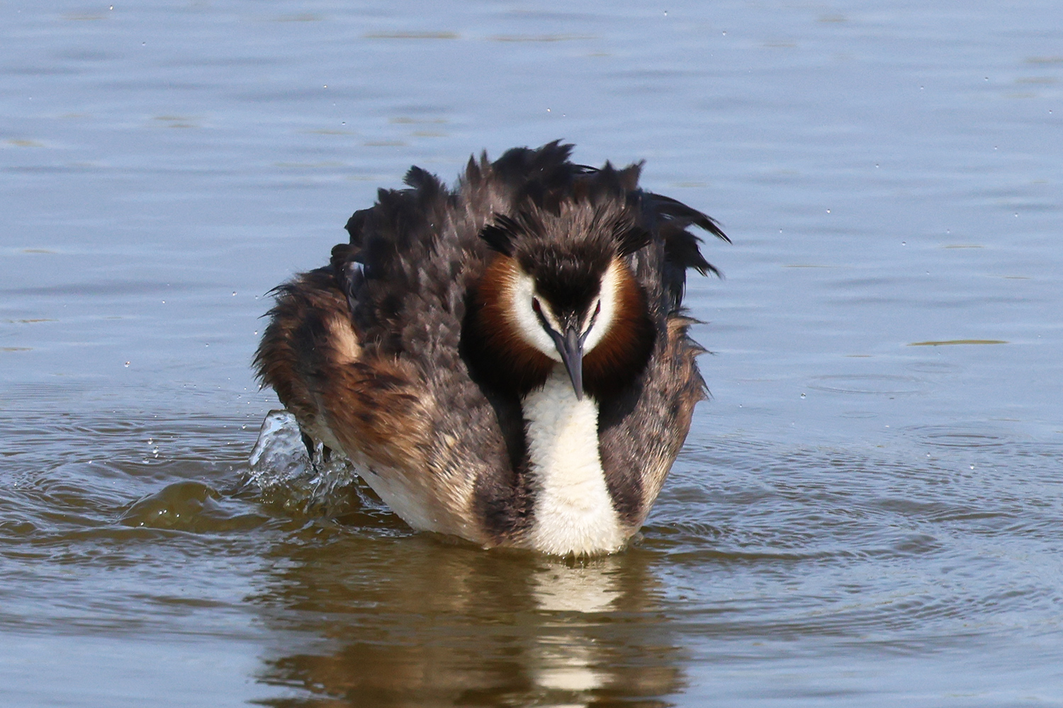 Quelques jours plus tard, au même endroit, mais avec une lumière meilleure et des postures un peu différentes, le grèbe huppé s’est encore livré à une opération de toilettage. Quelques images de cette deuxième scène.