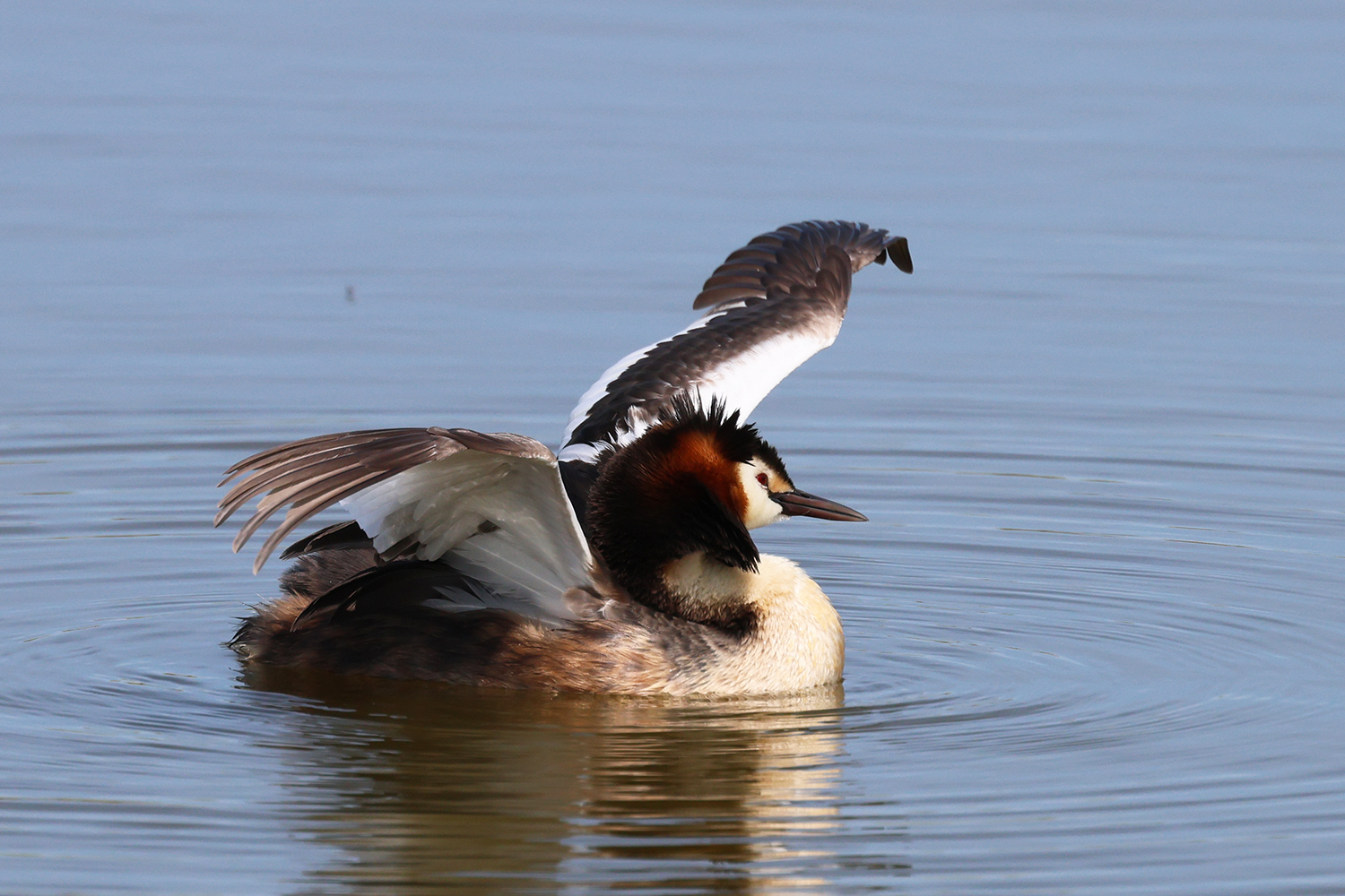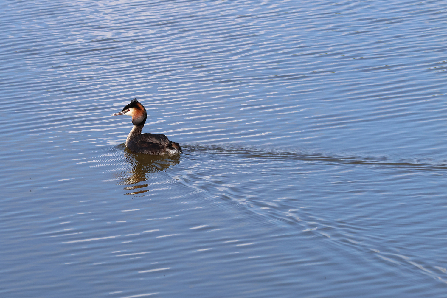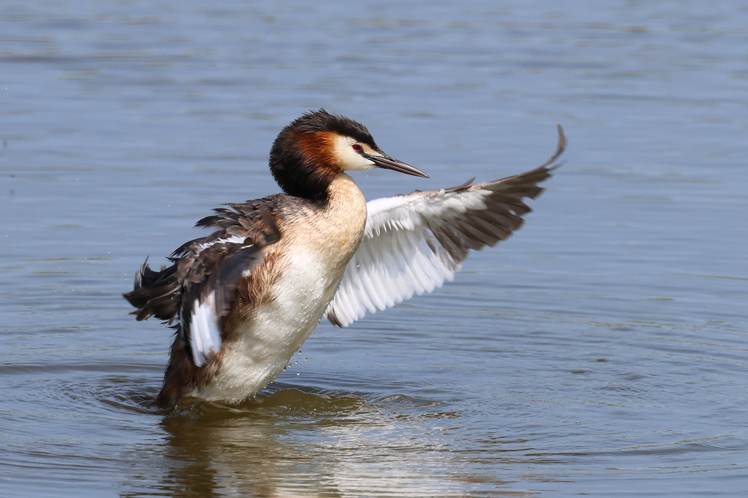 Quelques jours plus tard, au même endroit, mais avec une lumière meilleure et des postures un peu différentes, le grèbe huppé s’est encore livré à une opération de toilettage. Quelques images de cette deuxième scène.