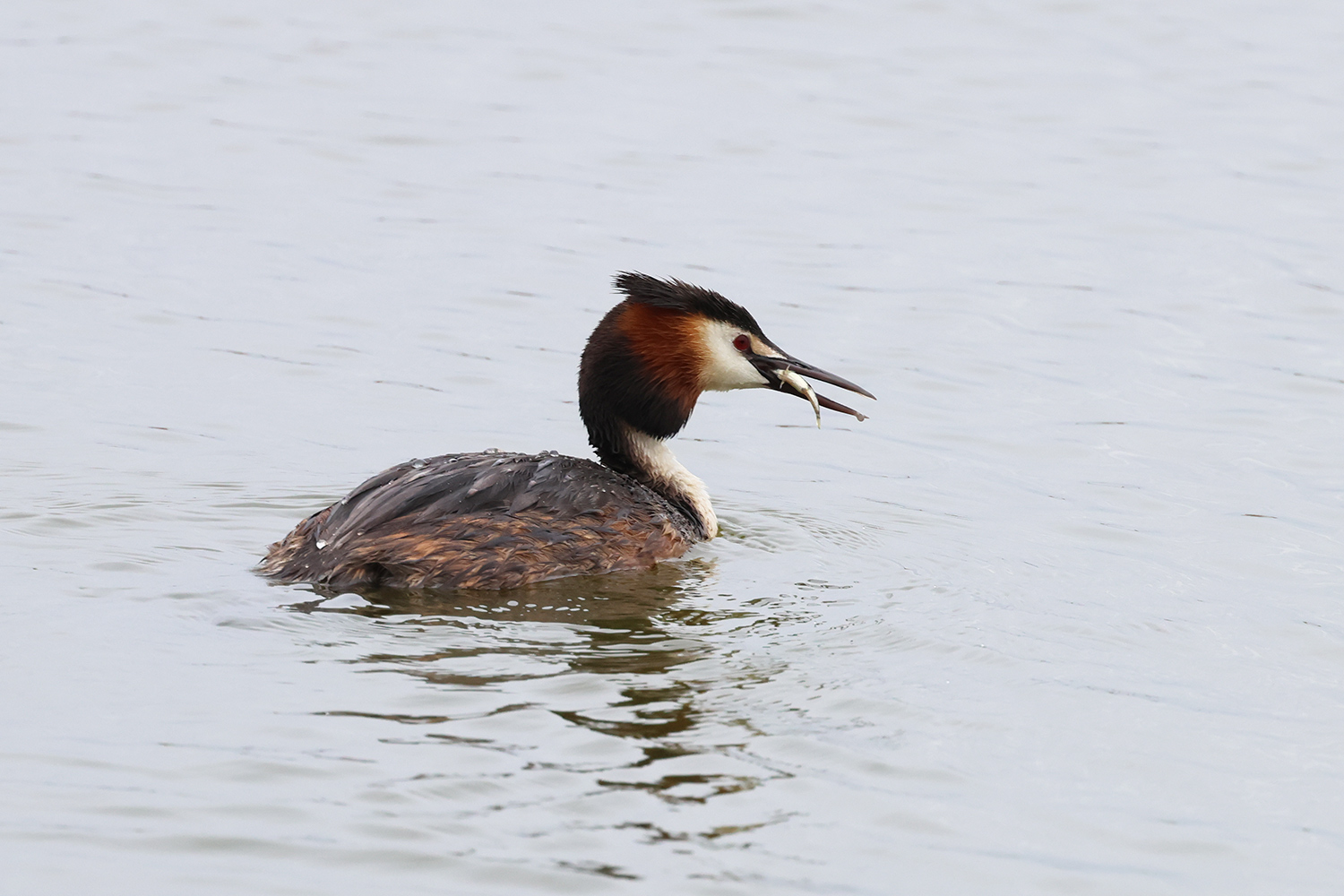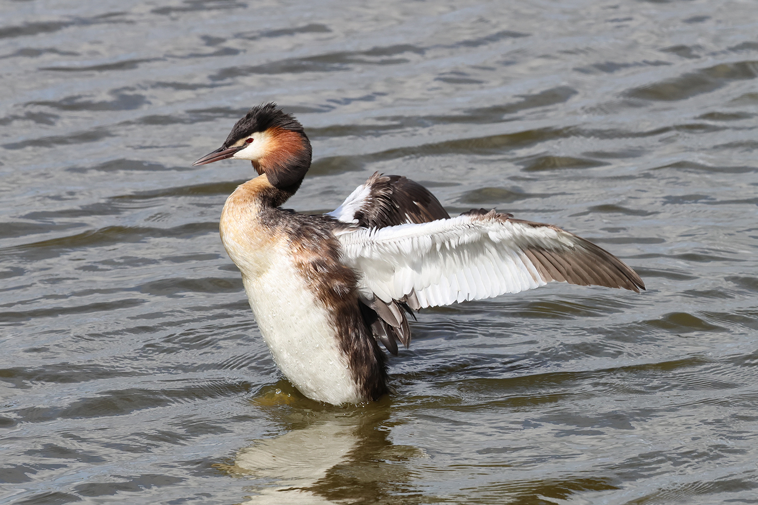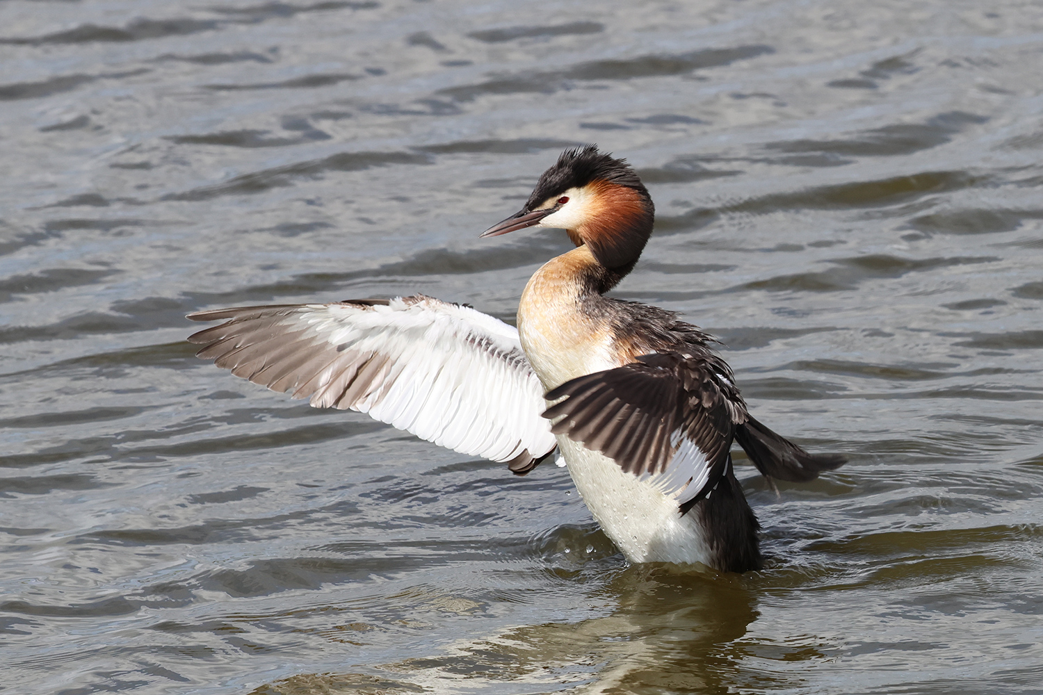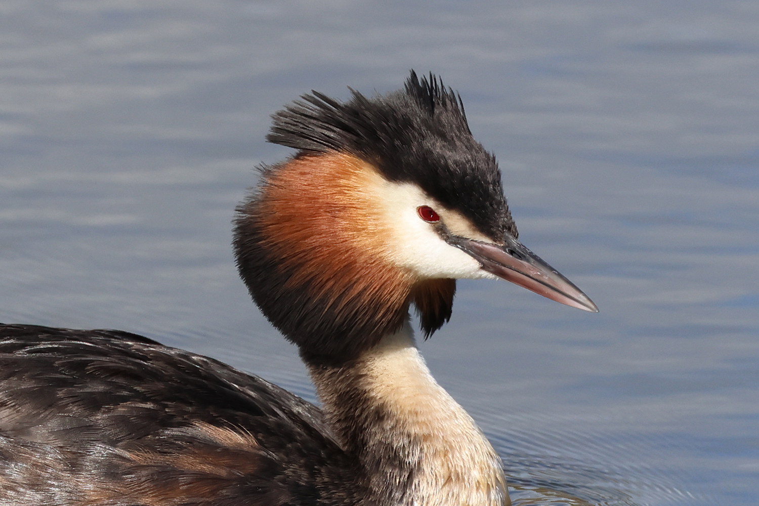 Quelques jours plus tard, au même endroit, mais avec une lumière meilleure et des postures un peu différentes, le grèbe huppé s’est encore livré à une opération de toilettage. Quelques images de cette deuxième scène.
