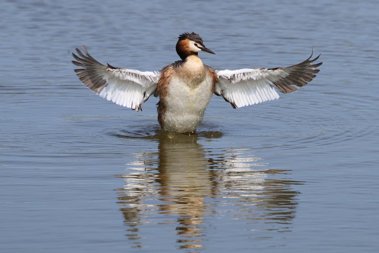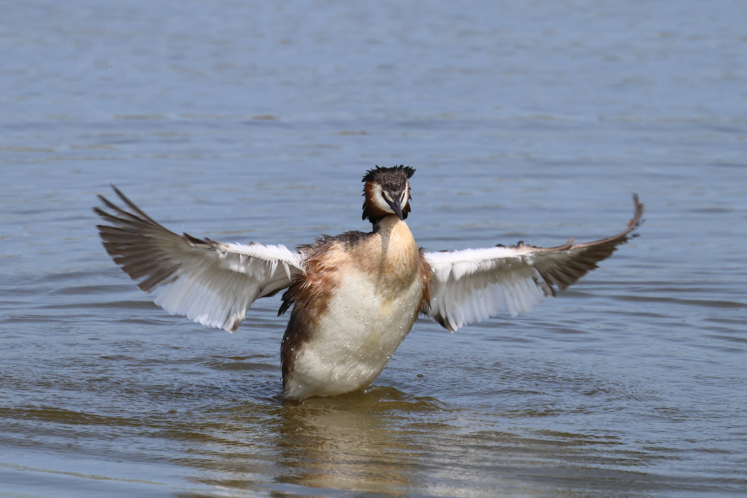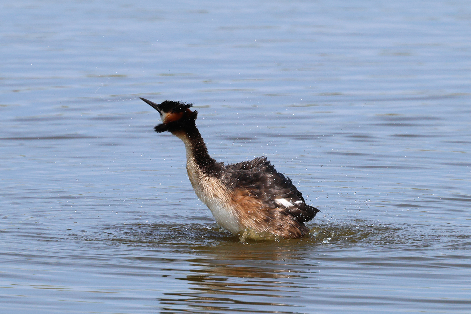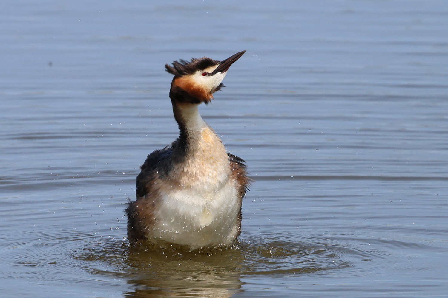 L’an passé en juin, lors de mon dernier séjour à Texel, je suis resté beaucoup de temps près d’un grèbe huppé qui était visiblement très habitué au passage des promeneurs (pédestres ou cyclistes) en attendant qu’il fasse un brin de toilette ou s’ébroue. Et évidemment, comme les oiseaux font leur toilette de nombreuses fois par jour (peut-être les oiseaux aquatiques encore plus que les autres), la scène espérée est arrivée assez vite. Voici trois images de cette scène.
